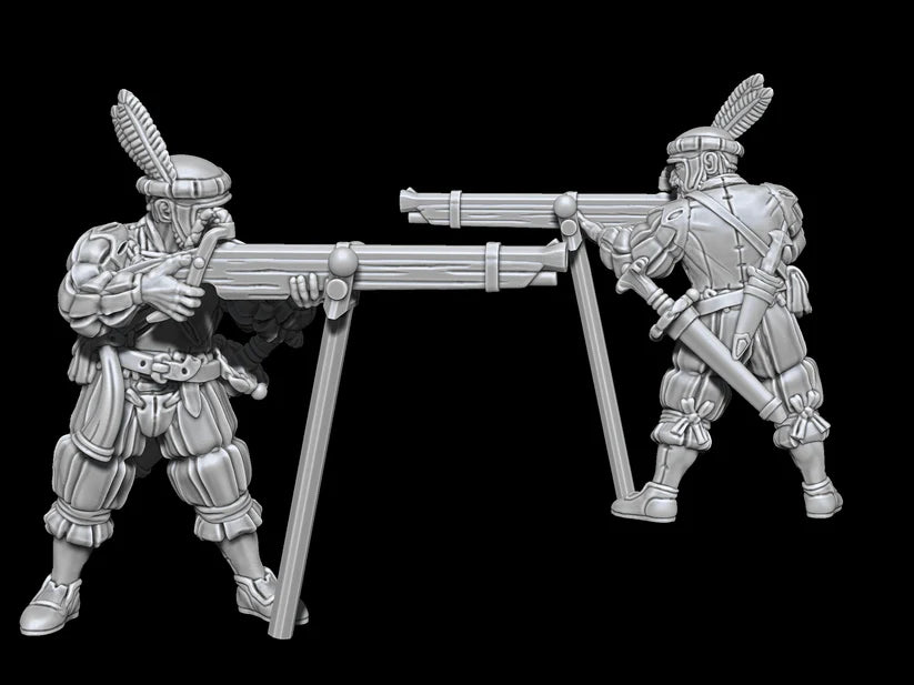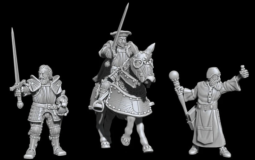 Sculpted by the incomparable Erramir Orlan of Peculiar Companions, these German Personalities are intended for armies from the 15th and 16th Centuries. This is a set of four 3D models. There is a mounted commander and a commander on foot, a priest, and a heavy arquebusier. All models come as both pre-supported and unsupported STL files.