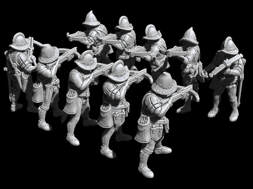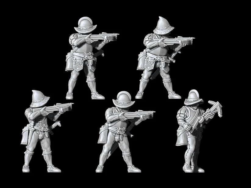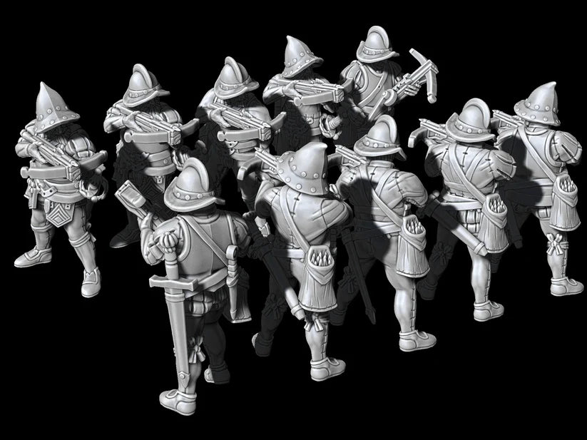 Sculpted by the incomparable Erramir Orlan of Peculiar Companions, these Spanish Crossbowmen and Halberdiers are intended for armies from the 15th and 16th Centuries. This set 3D models comes in three poses with five variations. All models come as both pre-supported and unsupported STL files.